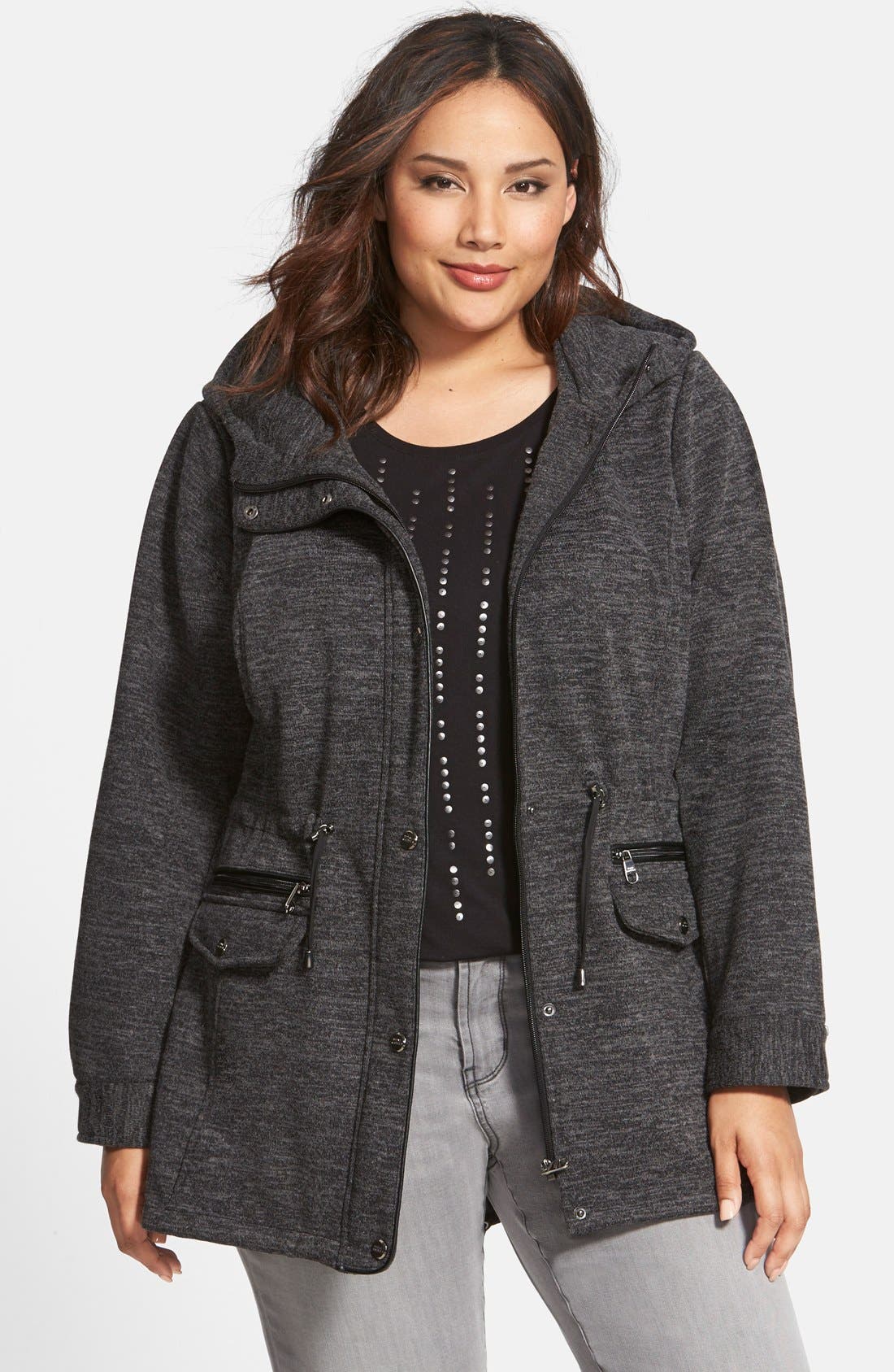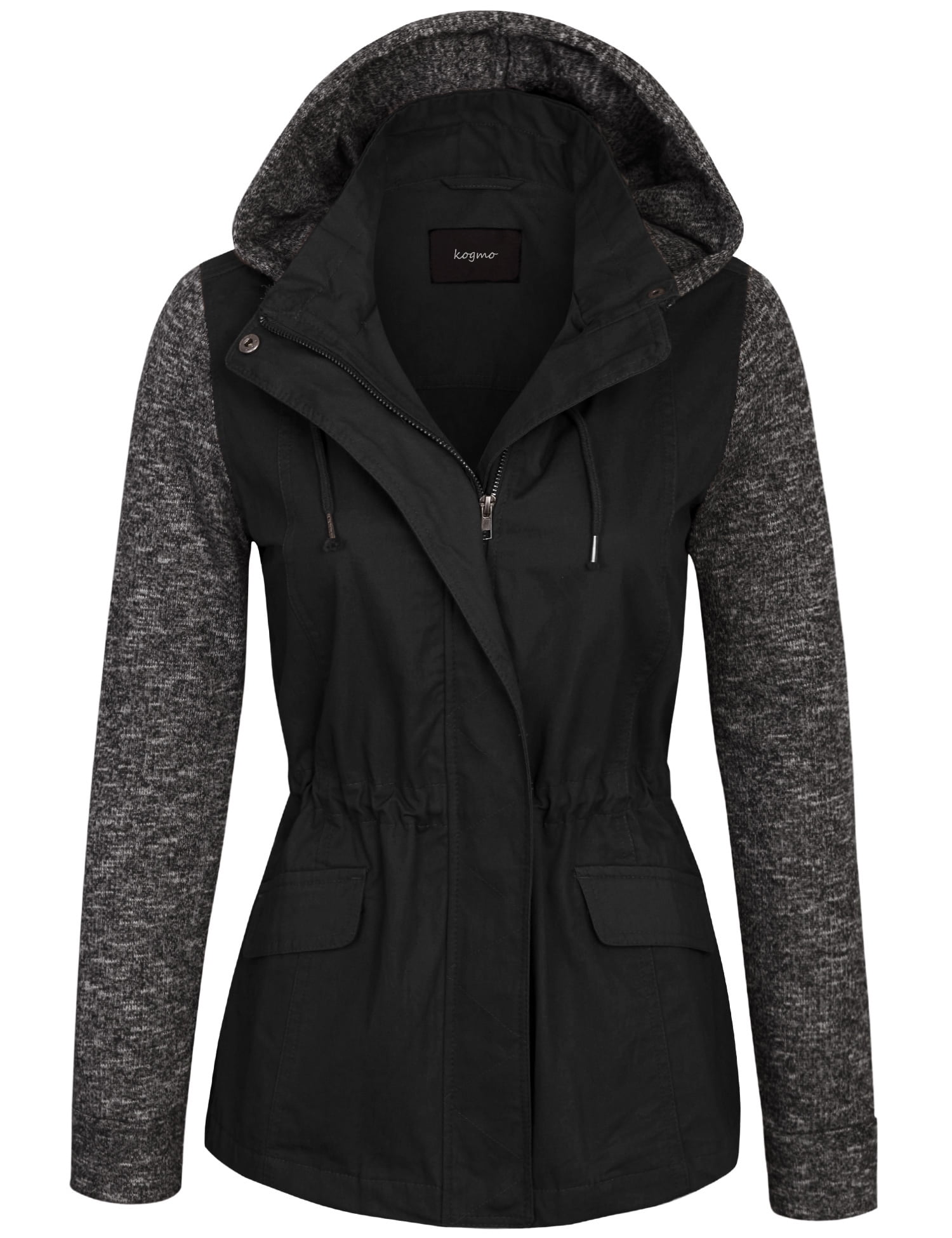 Gray cable knit sleeves add texture to this navy anorak jacket, finished with front pockets & zippers. (s) bust 46, waist 40 (l) 52, waist 46 fabric content: Women's knit anorak featuring adjustable toggles and lined hood. Hooded and has cover details at the end of the neck zipper. Reflective stripes at back for added visibility in low light.